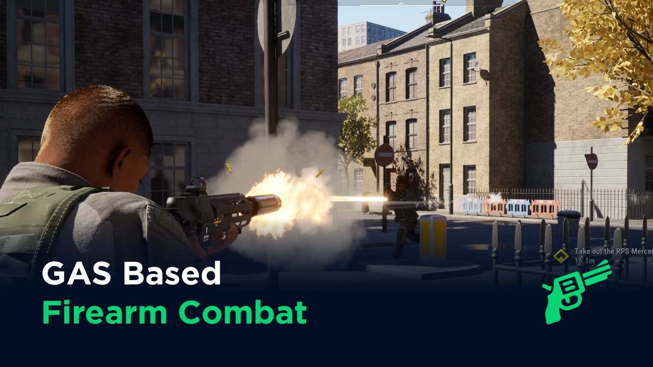 集成枪械射击与近战格斗双战斗体系,均基于 UE5 原生 GAS 搭建,支持技能、能力、武器系统的自定义拓展,贴合行业主流的游戏战斗开发标准。